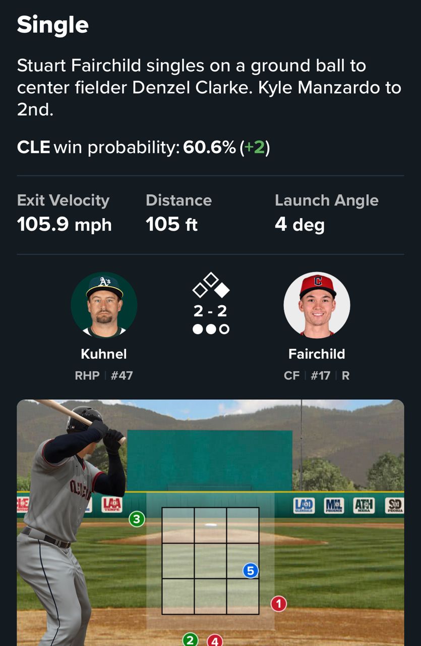 守護者今與運動家的熱身賽,費爾柴德擔任先發第五棒中外野手,首打席敲滾地球出局,