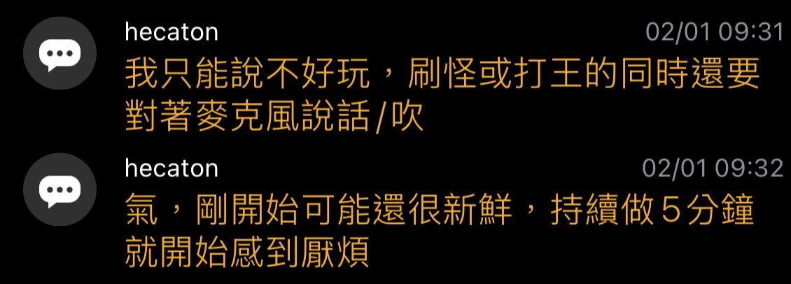→ : 我只能說不好玩,刷怪或打王的同時還要對著麥克風說話/吹8F 02/01 09:31