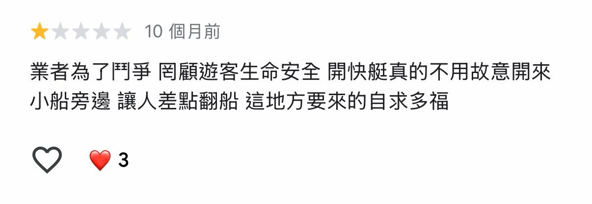 噓 : 那邊的快艇業者真的很垃圾,好幾年前去划274F 223.137.36.130 台灣 02/20 01:07