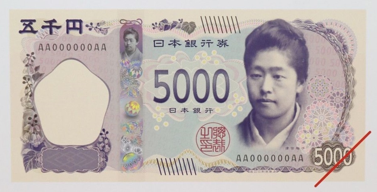 日幣5,000元的人物,則是著名的日本女子教育先驅者——津田梅子。津田生於1864年(本名津田梅,1902年改為津田梅子),是日本第一位留學美國的女學生之一。父親津田仙曾為幕臣,同時也是熱心教育的農學家。1871年(明治4年)津田梅子8歲時,在父親的安排下加入當時明治政府考察歐美的使節團,最後在美國留學生活,直到1882年(明治15年)才返回日本。