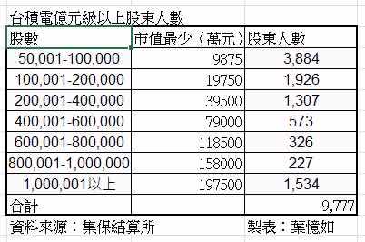逼2000元大關,股東若持有50張以上市值已經接近1億元。據集保結算所資料統計,台積