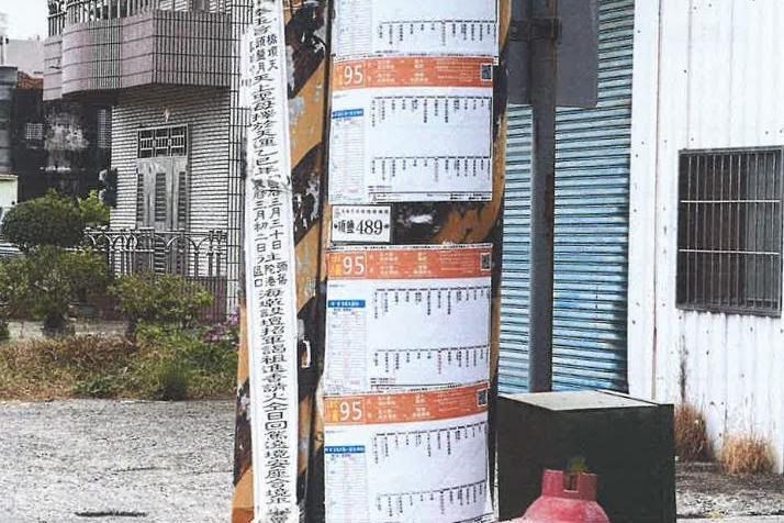 高雄市許多原縣區的公車資訊張貼在電線桿上,長久下來不僅破損嚴重、不易辨識,也影