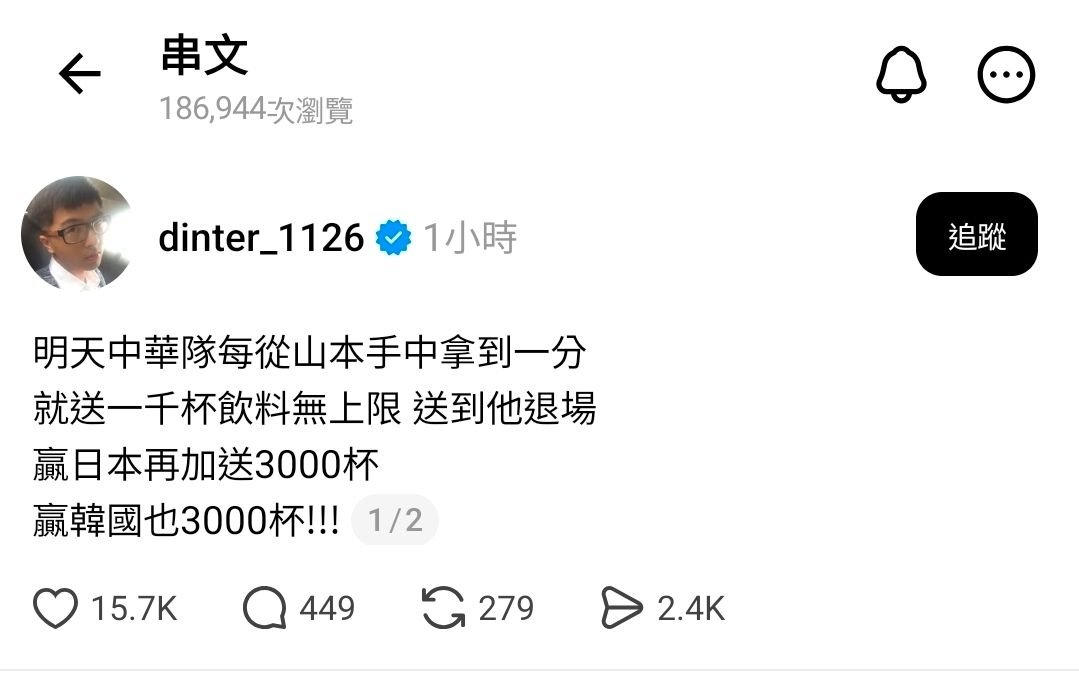 [特] 明天中華隊從山本手上拿分就送一千杯