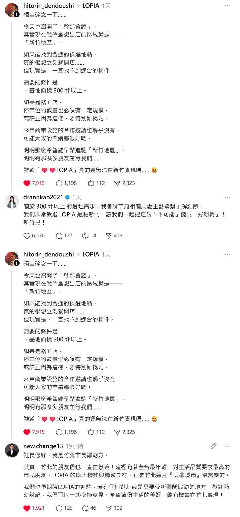 水元仁志感性寫道:「明明那麼希望能早點進駐新竹地區,明明有那麼多朋友在等我們……難道LOPIA真的還無法在新竹實現嗎?」