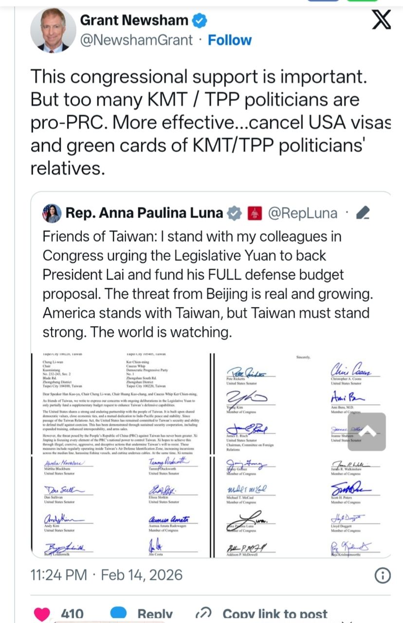 究員紐夏(Grant Newsham)轉發盧納貼文指出,國會支持很重要。但有太多國民黨、民