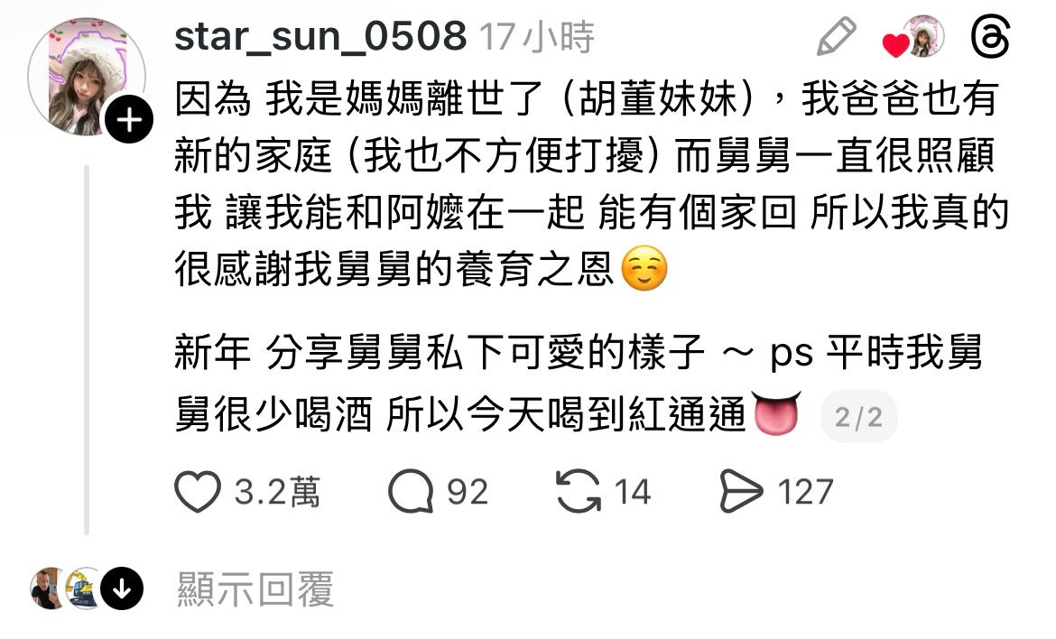 這女生是吊車大王亡妹所生,她爸爸另組家庭,就由胡董繼續留在家照顧。