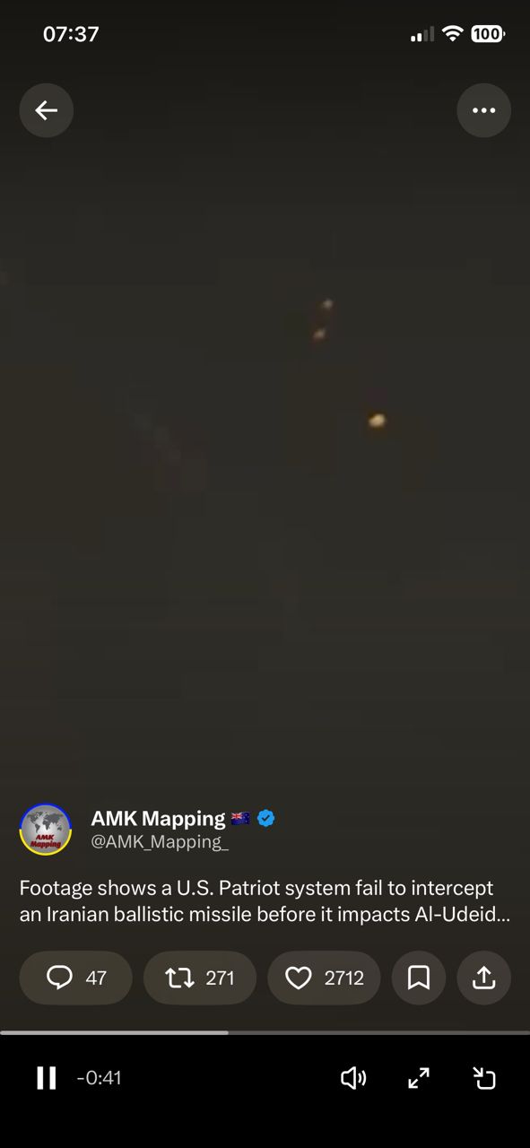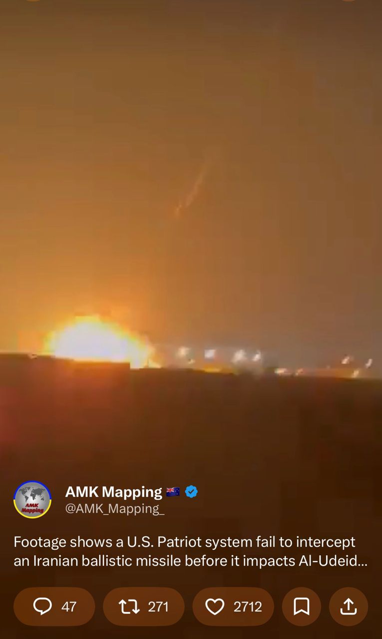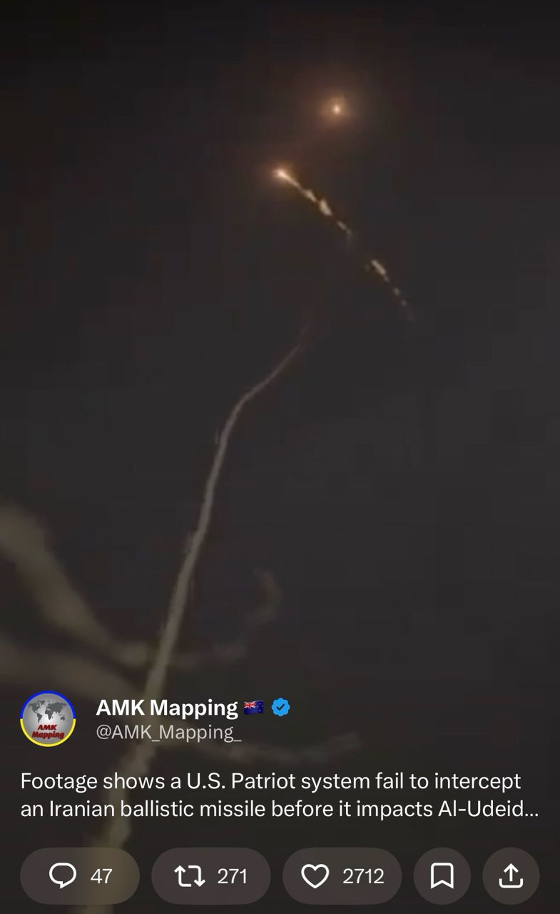 X軍事博主AMK貼一段影片,卡達空軍基地愛國者先發射兩枚,沒攔到